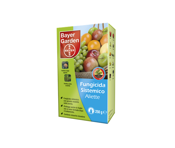 Aliette® Orto e Giardino è indicato per la protezione di vite, agrumi, frutticole, orticole e ornamentali. Agisce su peronospore, fitoftore e batteriosi con un duplice meccanismo d’azione: diretto, contrastando le crittogame con il suo principio attivo; indiretto, stimolando le naturali difese delle piante, le fitoalessine. Questo meccanismo d’azione evita problemi legati all’insorgenza di ceppi resistenti. Il prodotto penetra rapidamente nei tessuti vegetali con un basso rischio di dilavamento e manifesta una sistemia ascendente e discendente che garantisce un’ottima protezione di tutta la pianta. Aliette® Orto e Giardino può essere applicato sia in irrigazione che in irrorazione. Disponibile in confezione richiudibile con misurino dosatore.