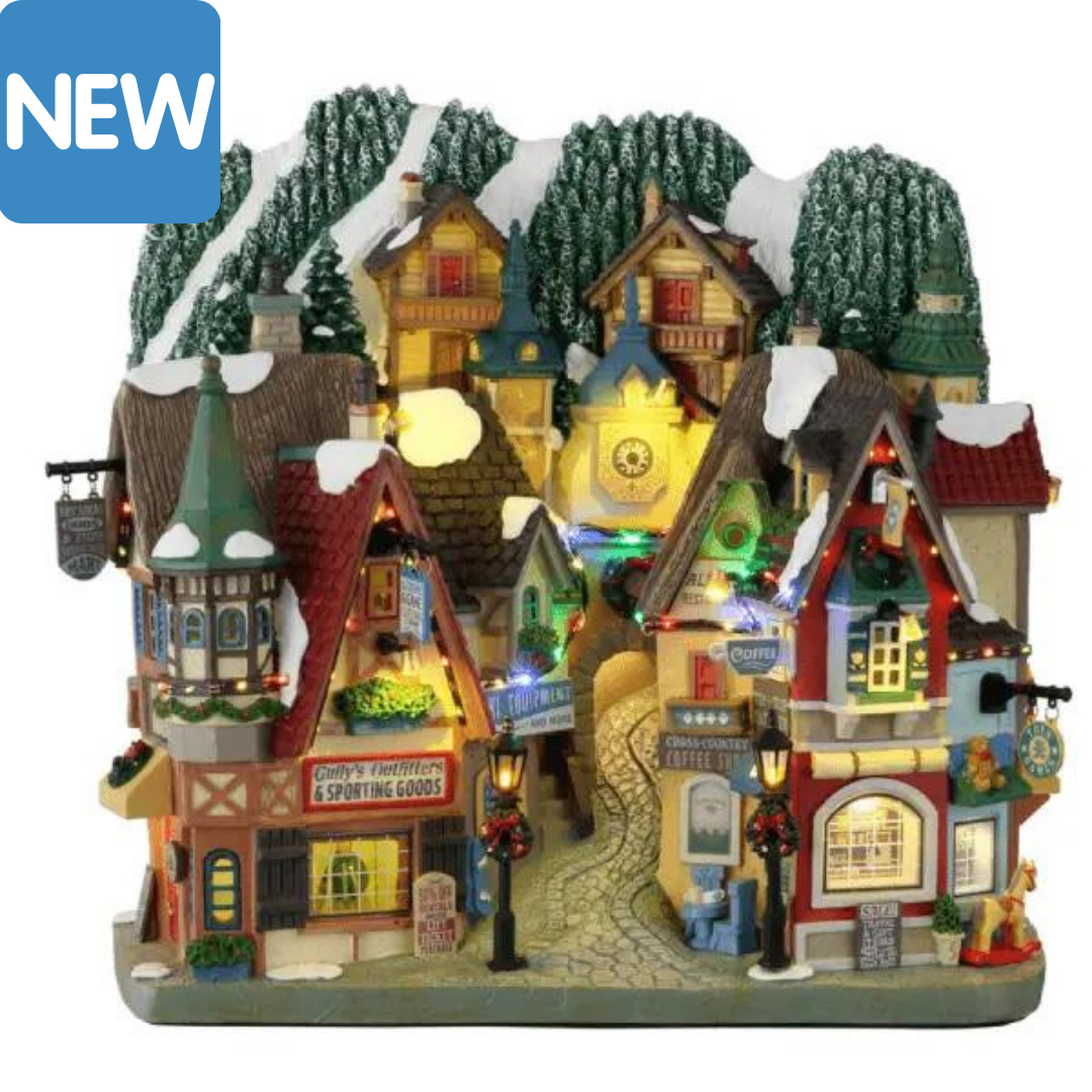 Hinterland Holiday 15738 è una facciata Lemax che raggruppa edifici e botteghe di periferia, addobbate a festa.