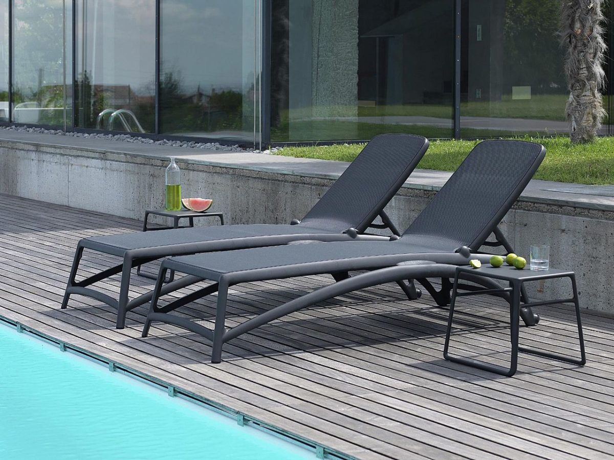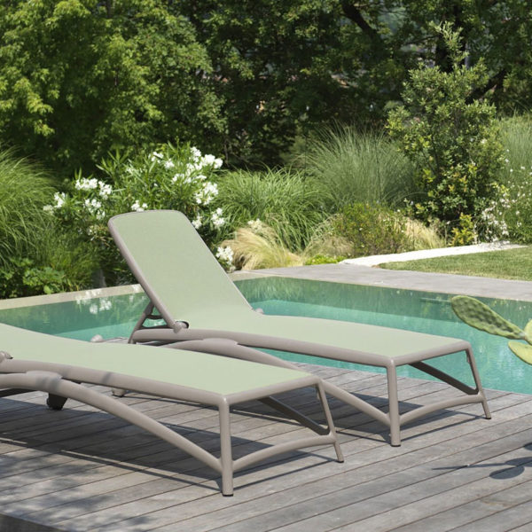 Forme ergonomiche che si adeguano in modo uniforme ed elastico allo scarico del peso e design filante per Atlantico, lettino prendisole con struttura in resina fiberglass e tessuto traspirante e ricambiabile. Schienale regolabile su quattro posizioni. Impilabile.