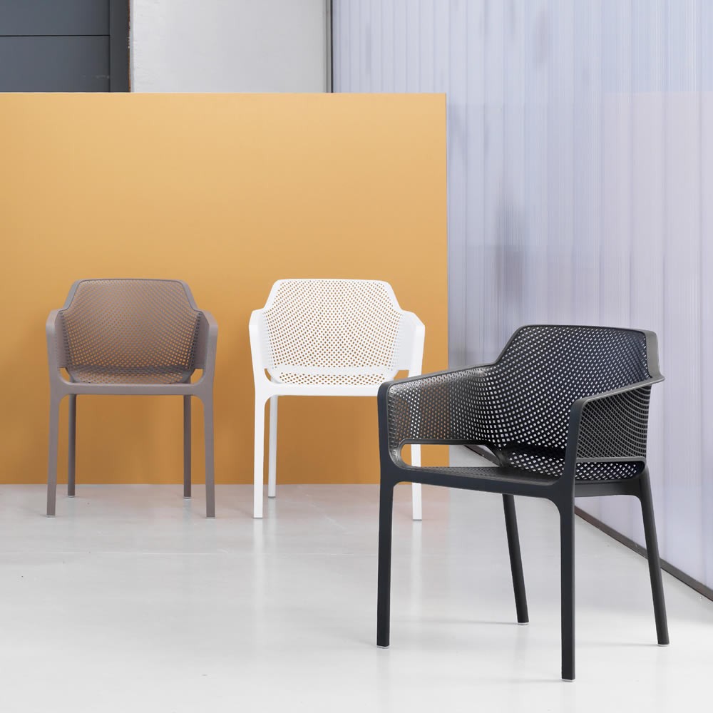 Raffinato relax per Net, monoscocca in resina fiberglass accuratamente bucherellata con un motivo a fori quadrati e raggiati distribuiti in continuità sulla superficie tridimensionale della seduta.