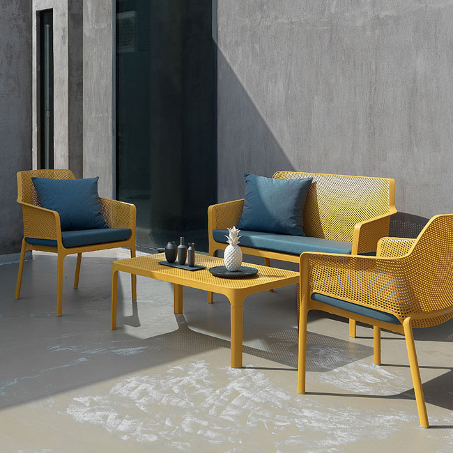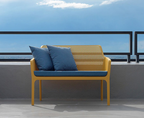 Romantica ed empatica, Net Bench è una panchina per esterni a due posti in resina fiberglass. Caratterizzata da un motivo a fori quadrati e raggiati, presenta linee pulite, profili sottili senza soluzione di continuità e un’ampia gamma di cuscini a corredo.