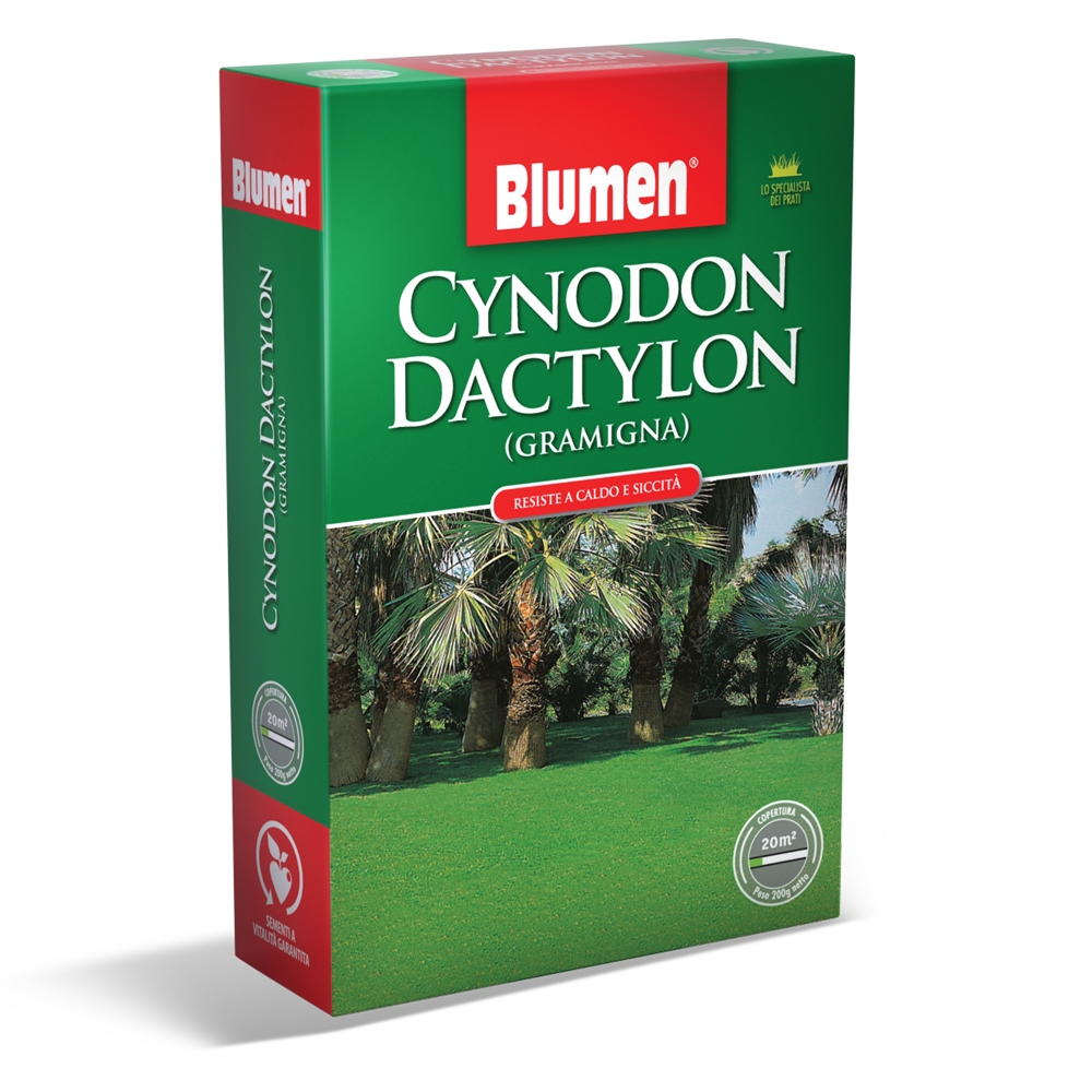 • Il Cynodon Dactylon (Gramigna) forma un tappeto erboso fittissimo e soffice, che resiste anche alle temperature molto elevate. Richi ede pochi interventi di manutenzione ed è molto resistente al calpestio. Il manto erboso mantiene il colore verde durante tutta l’es tate grazie al profondo apparato radicale e ai forti stoloni. Ha una ottima capacità’ di ricostruirsi in caso di chiazze dovute all’ usura.
