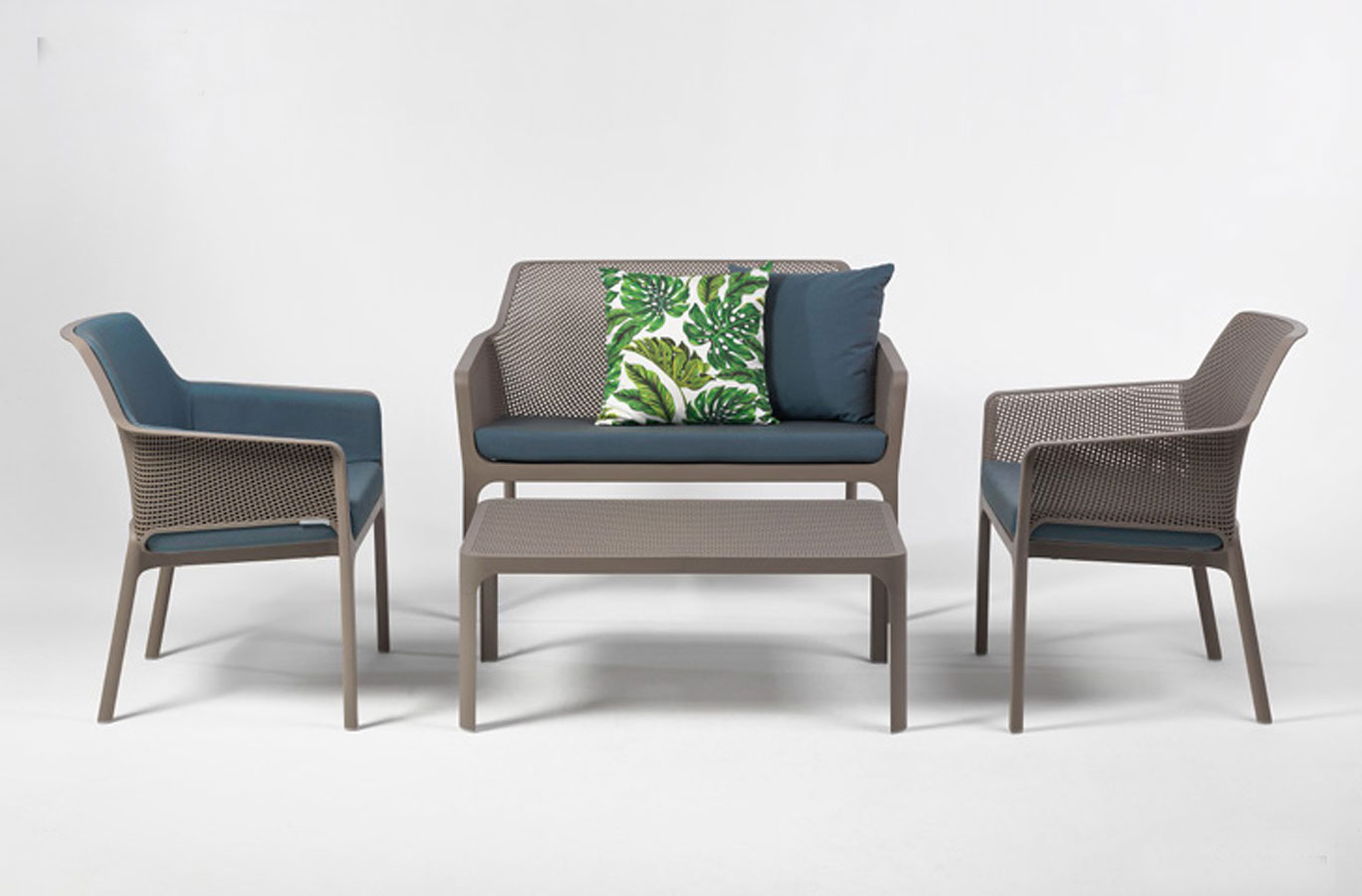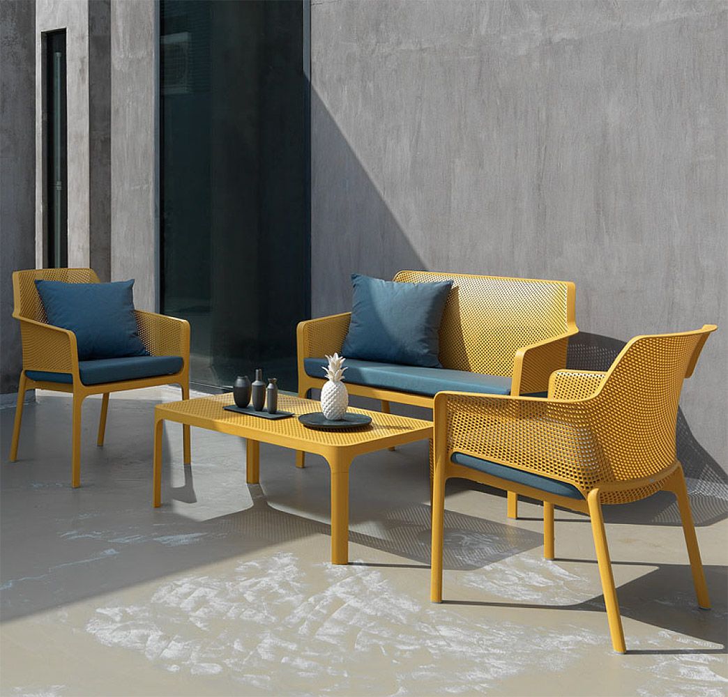 Elegante tavolo da appoggio in resina fiberglass colorata in massa con piano rettangolare caratterizzato da un motivo bucherellato che riprende il leitmotiv di tutta la collezione Net.