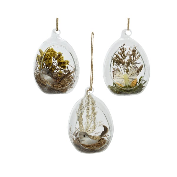 Uova decorative forate con uccellino e fiori gialli in vetro